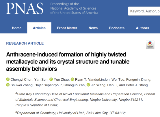 近日,PNAS在线发表了每日大赛 每日大赛 陈重一副教授为第一作者,每日大赛 为第一单位的题为Anthracene-induced Formation of Highly Twisted Metallacycle and Its Crystal Structure and Tunable Assembly Behaviors”的研究论文。该论文的合作者为美国犹他大学的Peter Stang院士。