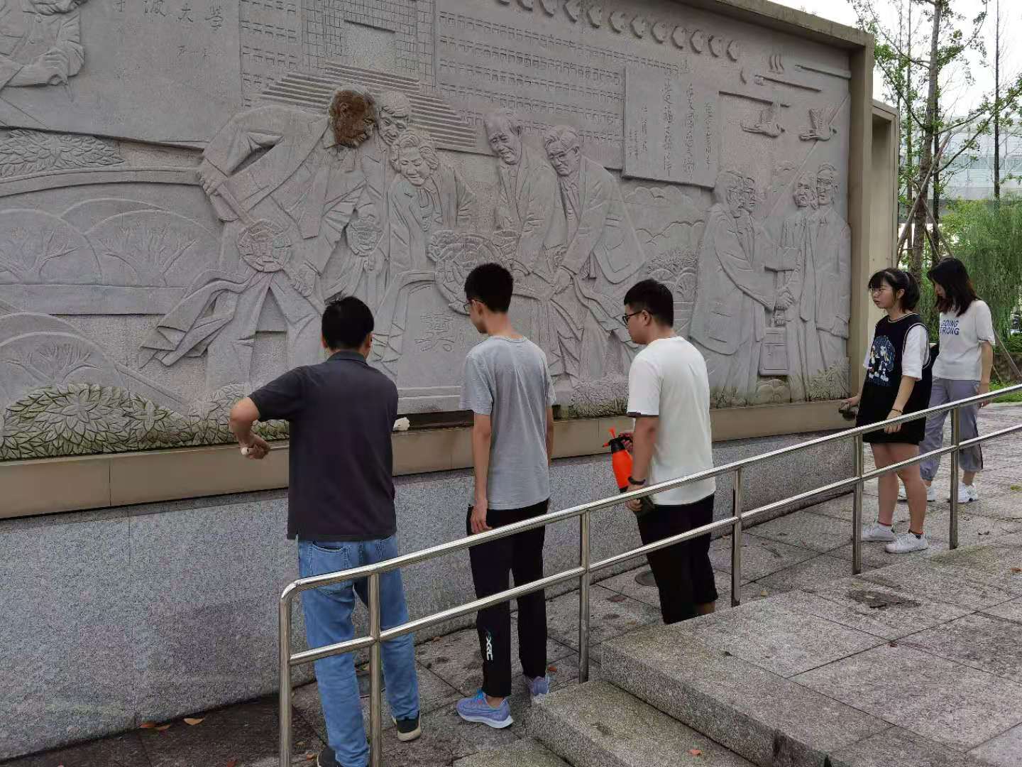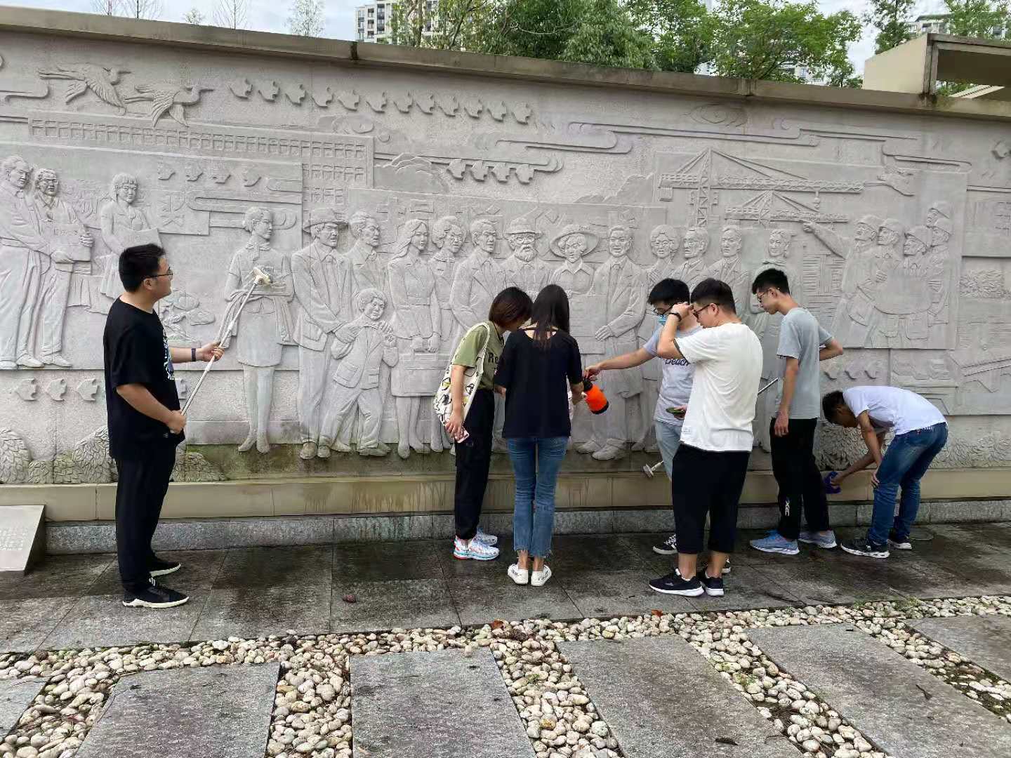 党员们对雕塑的底座进行卫生清理,清扫路面垃圾,擦拭石雕面等,同时还开展了环境卫生宣传。经过2个多小时的努力,感恩文化园环境焕然一新,同学们以实际行动创建文明校园,助力文明城市评比。