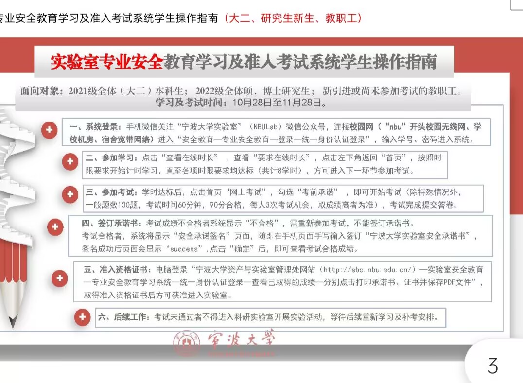 资产与实验室管理处网站//sbc.nbu. edu.cn/—实验室安全教育—专业通识教育学习系统—考生统一身份认证登录—在线考试—成绩查询—分别点击打印考试承诺书、证书并保存PDF文件”,取得准入资格证书后方可获准进入实验室。