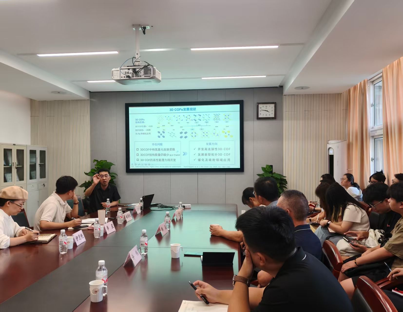 会上,兰教授为我院师生带来了一场题为《3D COFs结构设计合成及能源小分子转化》的精彩学术报告。报告中,兰教授分析了三维共价有机框架COFs的发展现状,并系统介绍了其团队在COF材料的设计合成、结构调控及其在电/光催化二氧化碳还原、以及新型电池等能源转化领域的最新研究进展。他深入浅出地讲解了不同类型拓扑连接的COF材料如何实现精准分子设计,并实现其性能的调控,同时也分享了其团队在攻克相关科学难题过程中的创新思路与宝贵经验。报告内容前沿丰富,讲解生动精彩,引发了在场师生的浓厚兴趣。在提问环节,大家踊跃发言,就报告中的科学问题、实验细节及研究方向等与兰教授进行了深入的交流与讨论,兰教授均给予了细致耐心的解答,与会师生均感受益匪浅。