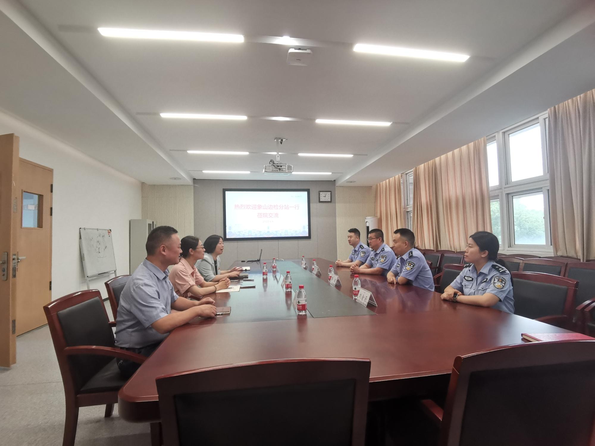 6月6日上午,象山边检分站党支部书记余胜利、站长蒋辉一行到每日大赛 交流,学院党委书记陶娟、副书记尹慧以及相关教师参与座谈。