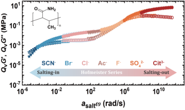 在水凝胶体系引入盐离子是提升材料力、电、热等性能的有效手段。Hofmeister效应是指大分子在水中的溶解能力随着外加盐的类型发生变化的现象。基于Hofmeister效应的功能水凝胶的设计成为了当前水凝胶领域研究热点。然而,基于Hofmeister效应的水凝胶的粘弹性调控的研究尚不多见。我院赵传壮课题组近期将Hofmeister效应和高分子物理中经典的“时温等效原理”结合起来,提出了“时盐等效原理”,用以诠释聚甲基丙烯酰胺(PMAm)水凝胶的粘弹性随着外加盐类型的剧烈转变的现象。该工作揭示了时盐等效性的物理起源——聚合物-水-盐三元相互作用,验证了概念的普适性,并基于这一概念探索了水凝胶的功能盐调控和盐加工的可能性。