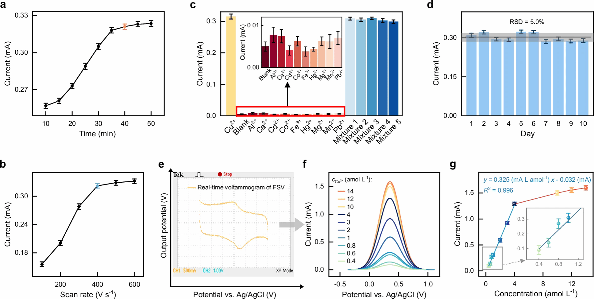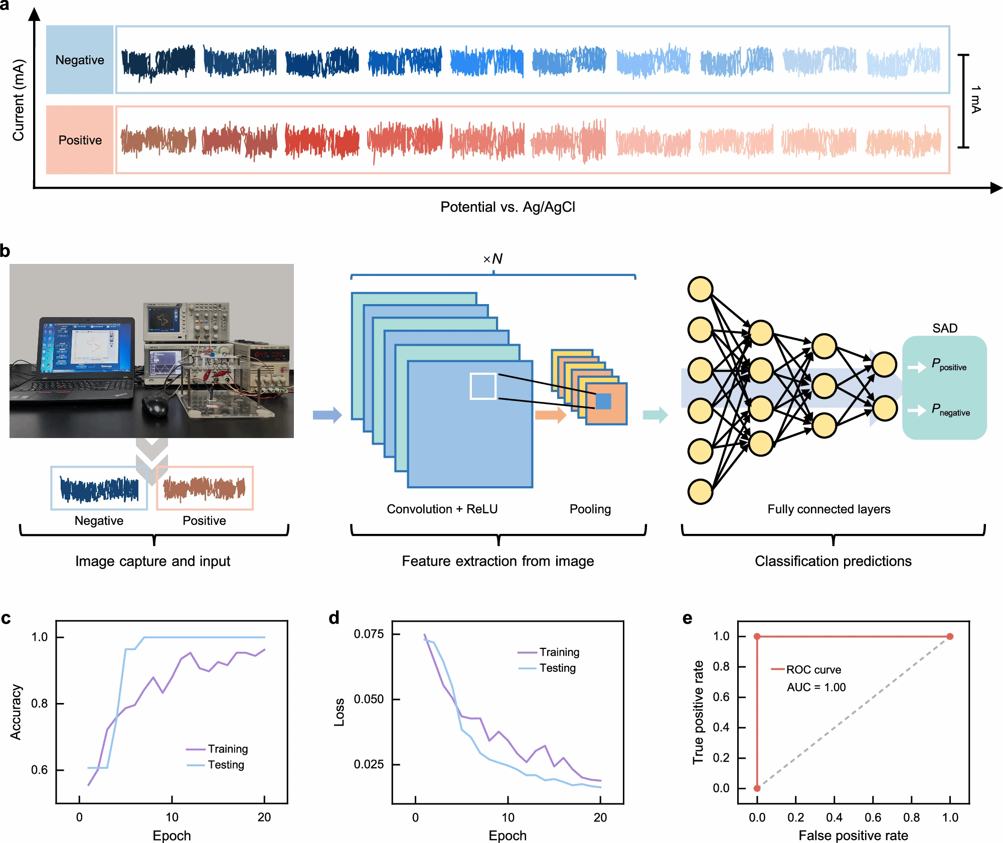 实验过程中,研究者测试中发现低浓度信号无法用常规电化学方法获取,然后他们采用了深度学习,成功提取了快速扫描伏安图中的隐藏特征和信号信息,从而实现了0.2 amol/L铜离子的单原子检测。