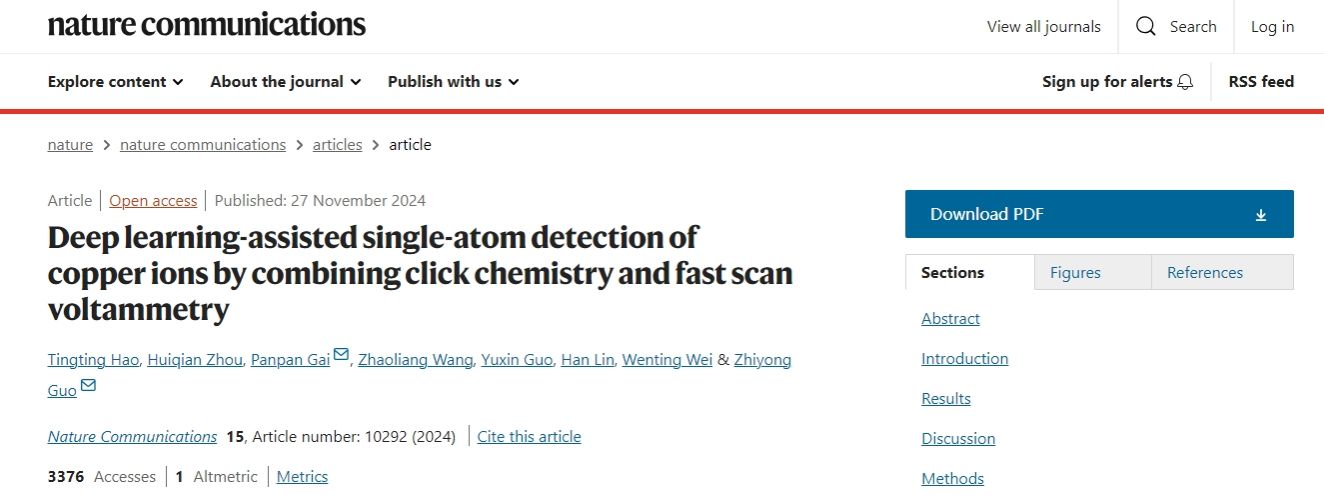 郭智勇科研团队在《自然》期刊子刊《Nature Communications》上发表了题为“Deep learning-assisted single-atom detection of copper ions by combining click chemistry and fast scan voltammetry”(深度学习辅助快速扫描伏安法检测单原子铜)的高水平研究论文。该研究首次实现了铜离子的单原子检测,为分析化学和生命科学领域提供了全新的研究思路。郝婷婷博士和研究生周会茜为共同第一作者,郭智勇教授和盖盼盼教授为共同通讯作者,每日大赛