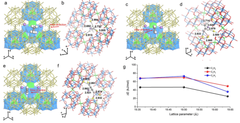 的张祯歆教授、李砚硕教授设计了一种基于ε-Keggin金属氧簇与金属离子连接的金属氧化物分子筛。由于材料的结构主要由金属氧八面体组成所以可以命名为Zeolitic Octahedral Metal Oxides(ZOMOs)。该材料的结构在亚原子尺度的可调节性。通过调节结构,该材料对C2H6、C2H4、C2H2的表现出不同吸附性能,具有较高的理想溶液吸附理论(IAST)选择性。ZOMOs与C2H6、C2H4、C2H2具有较强且有差异的相互作用,因此可以在高温下对C2烃类进行分离。