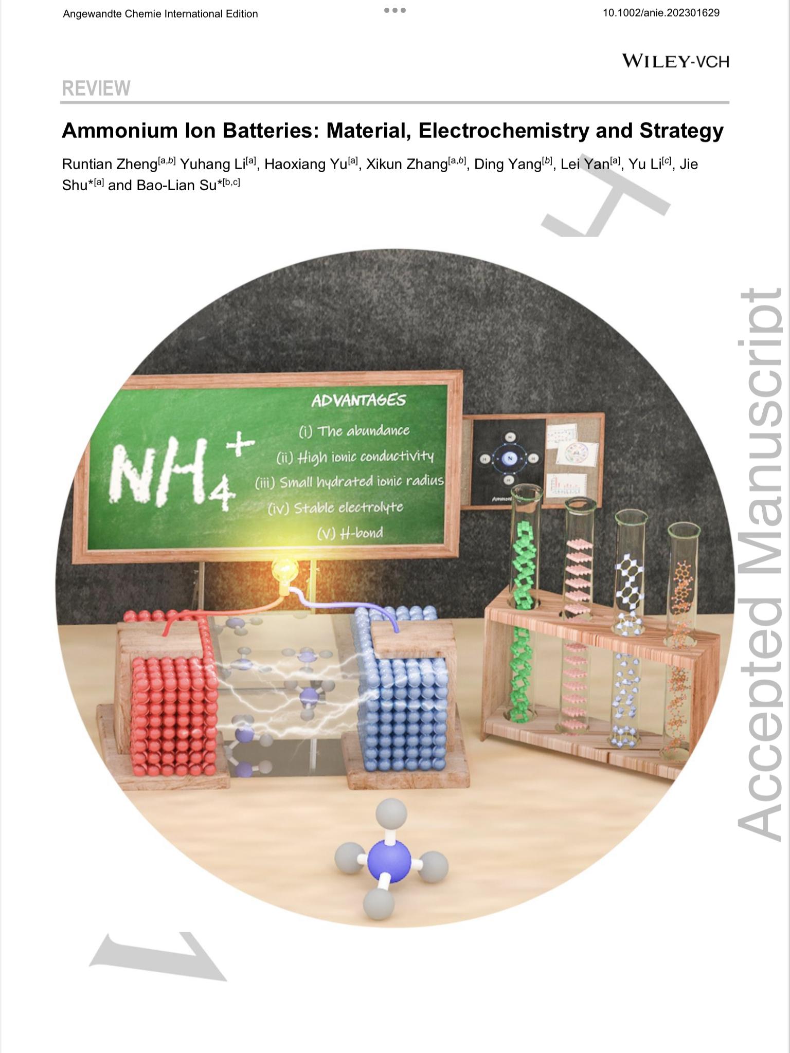 近日,每日大赛 能源化学团队在新型电池领域取得了重要进展,该团队针对水系铵离子电池中的关键科学和技术问题进行了梳理分析,重点阐述了铵离子电池的结构设计、电极材料的选用及电解液的匹配优化问题,相关结果发表在国际顶级期刊德国应用化学Angewandte Chemie International Edition上,每日大赛 是论文的第一署名单位,硕士生郑润田为第一作者,舒杰教授为通讯作者。