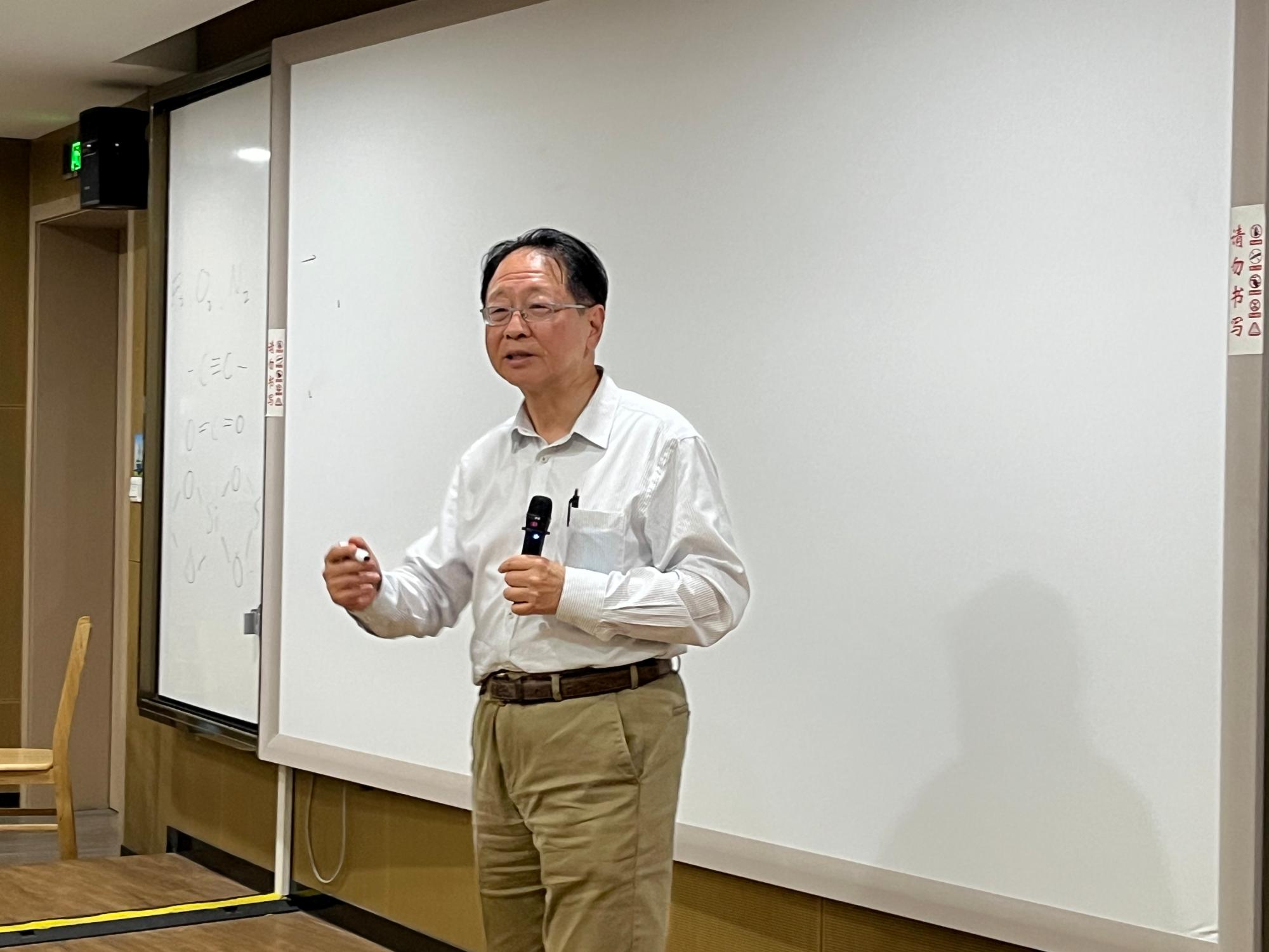 郑院士师从著名化学家、1996年诺贝尔化学奖获得者斯莫利(R.E.Smalley)教授,长期从事原子团簇科学研究。他从基础理论切入,结合留学科研时的经历,深入浅出地为学院师生们解释了原子团簇的相关问题,阐述了纳米材料与原子团簇的区别。随后,郑院士用足球做教具,生动形象地讲解了C60的结构和原子团簇研究进展,展望了学科发展的前景。