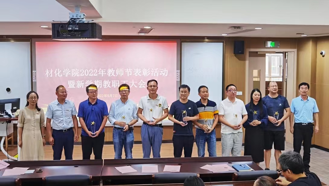 党委副书记朱燕主持。学院特聘院长丁传凡宣读2021-2022年度校级优秀名单,院党委书记罗云杰宣读2021-2022年度院级优秀共产党员、优秀党务工作者名单,副院长韩磊宣读优秀班主任以及最美材化人表彰名单,同时院领导向院级先进颁发奖杯。沉甸甸的奖杯代表着老师们的辛勤付出与收获,也激励全体教职工接续奋斗,奋勇争先,在新学期争创新辉煌。