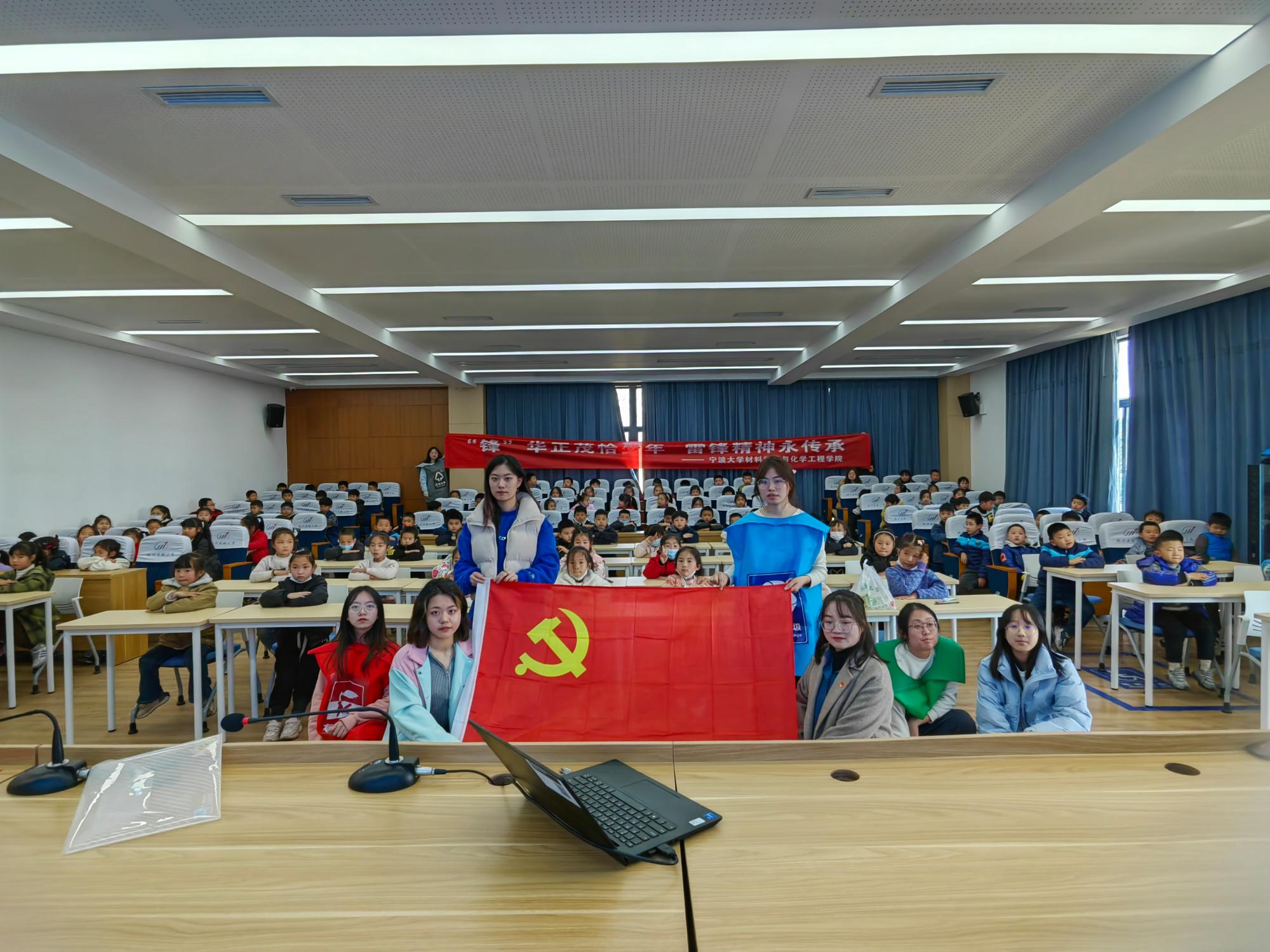 科教融合第一党支部、青年志愿者协会的同学组成,面向蛟川实验小学120多名一年级小学生开展雷锋精神宣讲微课、情景剧表演等多种形式的活动,讲述雷锋故事,赓续雷锋精神。