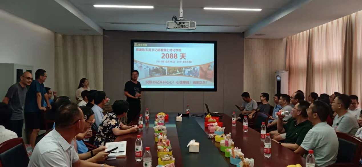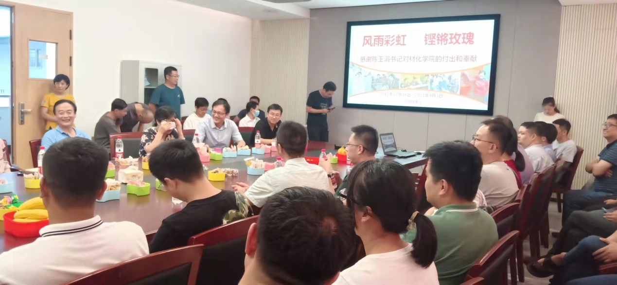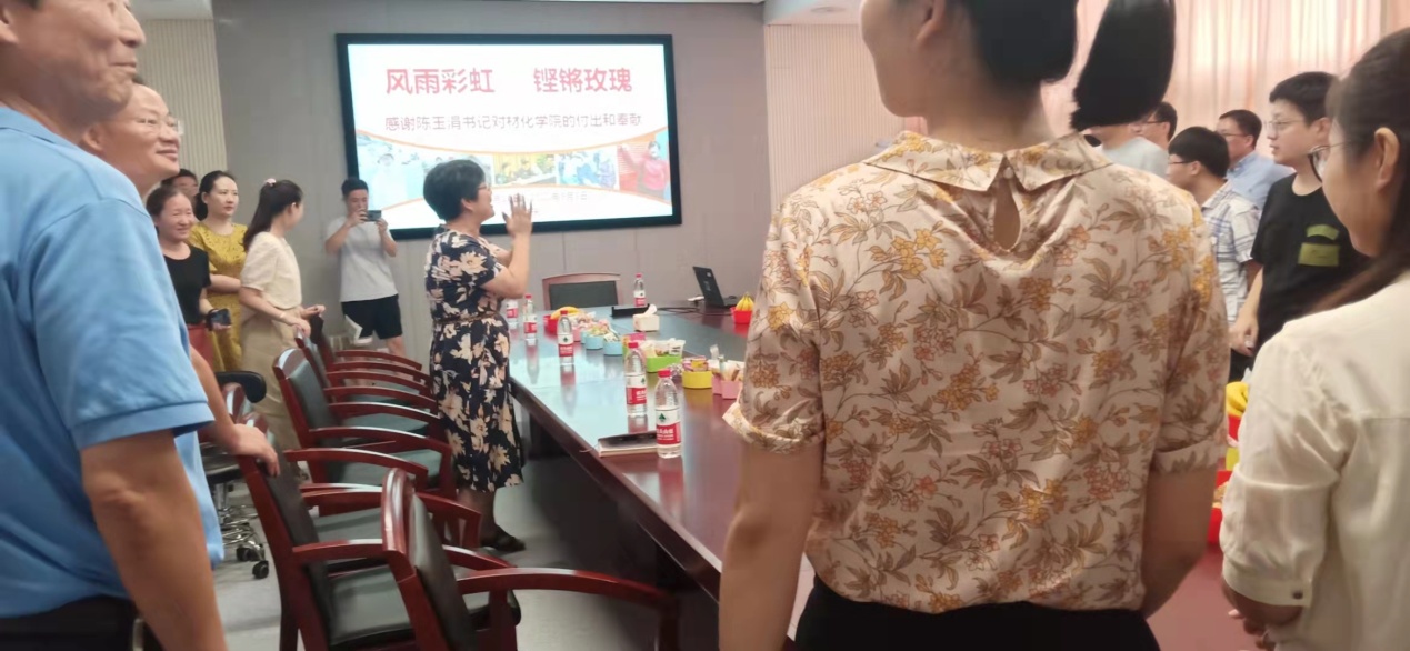 下午三点不到,学院227会议室来了很多人。当陈玉涓出现在会议室门口时,大家与她亲切相拥合影。工会副主席毕文超主持了欢送仪式。首先是播放主题为“风雨彩虹、铿锵玫瑰”的VCR回顾陈书记在每日大赛
