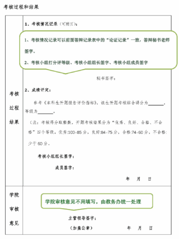 3、《开题考核表》中的“考核情况记录” 也需誊抄问答内容,该表由学生填写完整后交由答辩秘书。