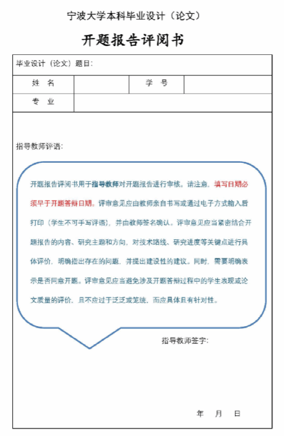 ②评阅书评语内容需针对开题报告内容,评价研究方向、技术路线、进度安排等,指出问题并提出建议,明确给出是否允许开题的意见,评语不得涉及答辩表现或论文最终评价。