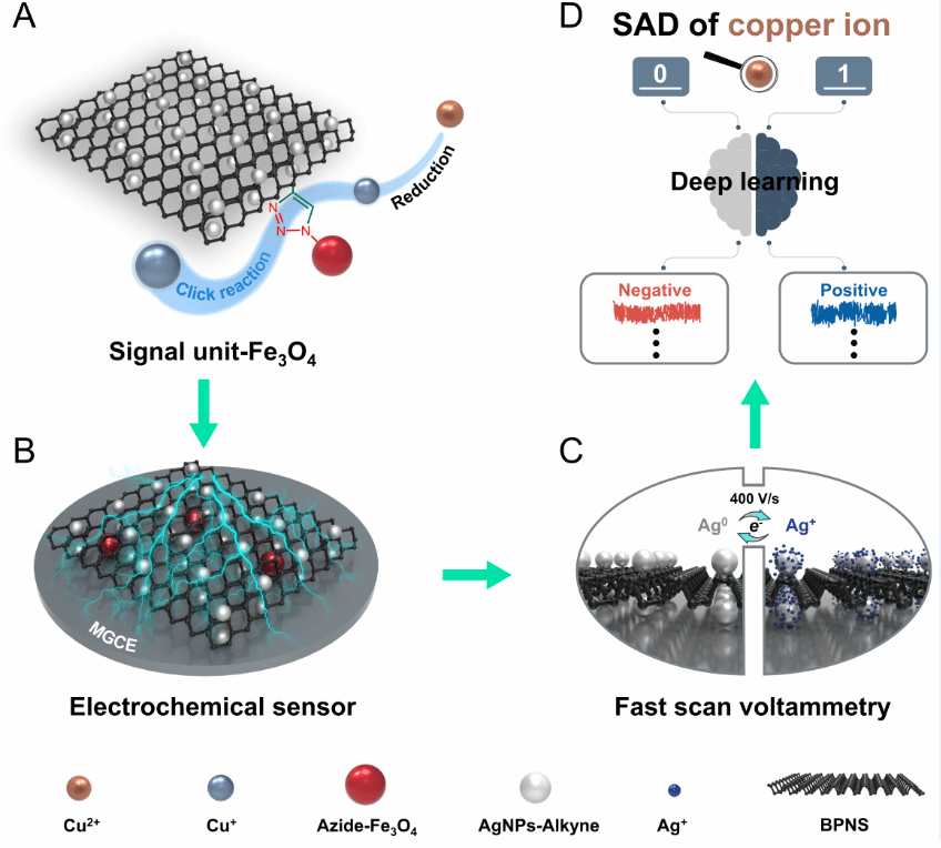 铜离子在细胞离子通道调节、细胞增殖和转移等生物学过程中扮演重要角色,但其痕量甚至单原子水平的检测一直面临技术挑战。铜离子介导细胞离子通道、铁离子维持细胞代谢等生命活动,均离不开痕量金属离子的调控。对金属离子进行单原子检测,有助于进一步理解微观环境中原子水平下的动态过程。本研究中,作者基于单个铜离子对Cu(I)催化的叠氮-炔点击化学反应(CuAAC)的特异性催化行为,采用功能化生物纳米材料放大信号物数量,采用快速扫描伏安技术放大信号强度,采用深度学习技术辨识和提取微弱信号,实现了铜离子的单原子检测。