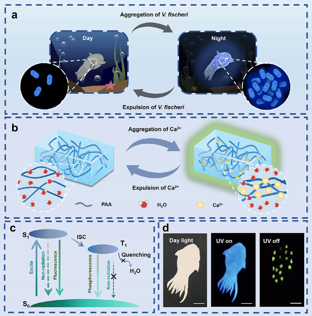 针对这一挑战,该课题组学习了夏威夷短尾鱿鱼的生物发光调控机制——通过昼夜节律精准控制共生细菌的储存与释放,将这一“动态浓度梯度调控”的生物机制迁移至软材料设计,为解决RTP水凝胶“长余辉”与“可编辑”的矛盾提供了全新范式,对推动智能材料向“动态响应、多维调控、场景适配”方向发展具有重要科学价值与实用意义。