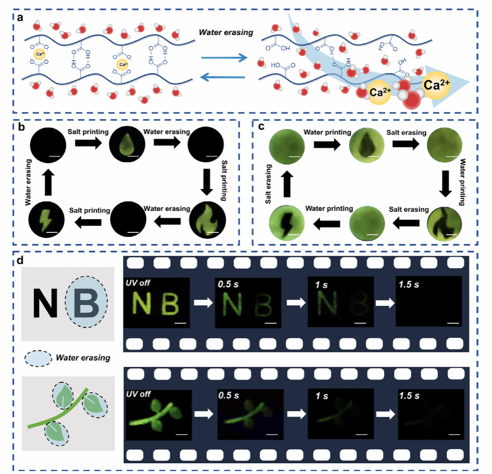该水凝胶具备多维度动态功能:“水擦除” 时,去离子水通过渗透压驱离Ca2+,使配位键断裂、磷光猝灭(6 min 内寿命 < 10.0 ms),再浸CaCl2溶液可恢复,循环 20 次性能稳定;“盐印刷” 借助图案化掩模与CaCl2粉末,能精准制备复杂发光图案。此外,刚硬化水凝胶有热软化特性,升温后杨氏模量和磷光余辉下降,赋予其形状记忆功能以实现 3D 信息加密;依靠DETA与PAA之间的电荷辅助氢键,水凝胶断裂后力学强度可恢复至原始值90%左右,具备自修复能力支持发光图案重构。这些功能协同推动了动态可编程信息显示等创新RTP系统的开发,研究通过结合仿生离子调制工程与超分子设计原理,为自适应智能发光材料构建提供了有效范例。